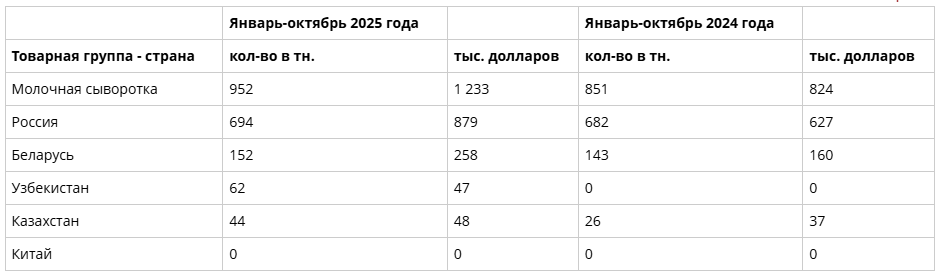 Внешнеторговый оборот Кыргызстана в сегменте молочной сыворотки демонстрирует положительную динамику. Согласно отчету Нацстаткома, за период с января по октябрь 2025 года в республику было ввезено 952 тонны данной продукции.