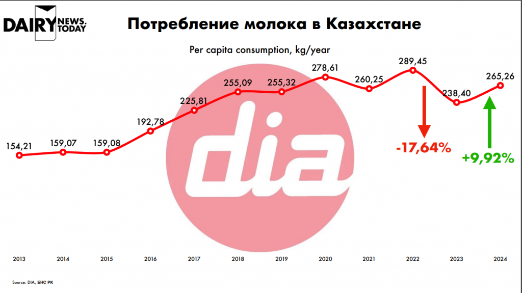 потребление молока на душу населения увеличилось почти на 10%, достигнув 265 кг/год.