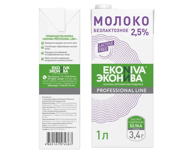 «ЭкоНива Professional Line» — безлактозное молоко 2,5% для HoReCa и бариста (Россия)