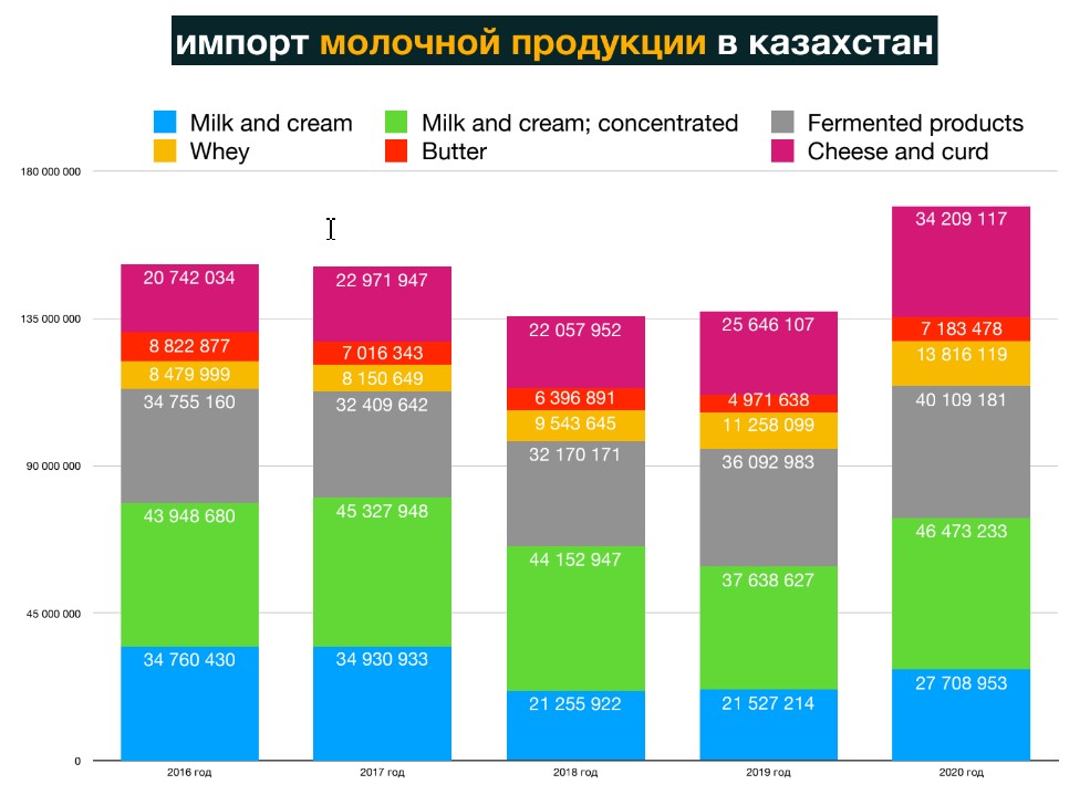 "Здесь, конечно, большой вопрос государственной политики, потому что мы в недостаточном объеме поддерживаем эту отрасль. Если говорить о молочной отрасли, то мы практически в два раза меньше поддерживаем [по сравнению] с Россией, в четыре раза меньше, чем с Беларусью», - отметил Ербол Есенеев.